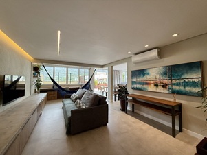 Apto. 3 dormitorios en suite, amueblado, equipado y decorado, frente total al mar en Ingleses Norte. 143 m² con 3 lugares de garage. Edificio con piscinas, sauna, gimnasio, salón de fiestas, espacio kids, parrilleros externos y sala de juegos.