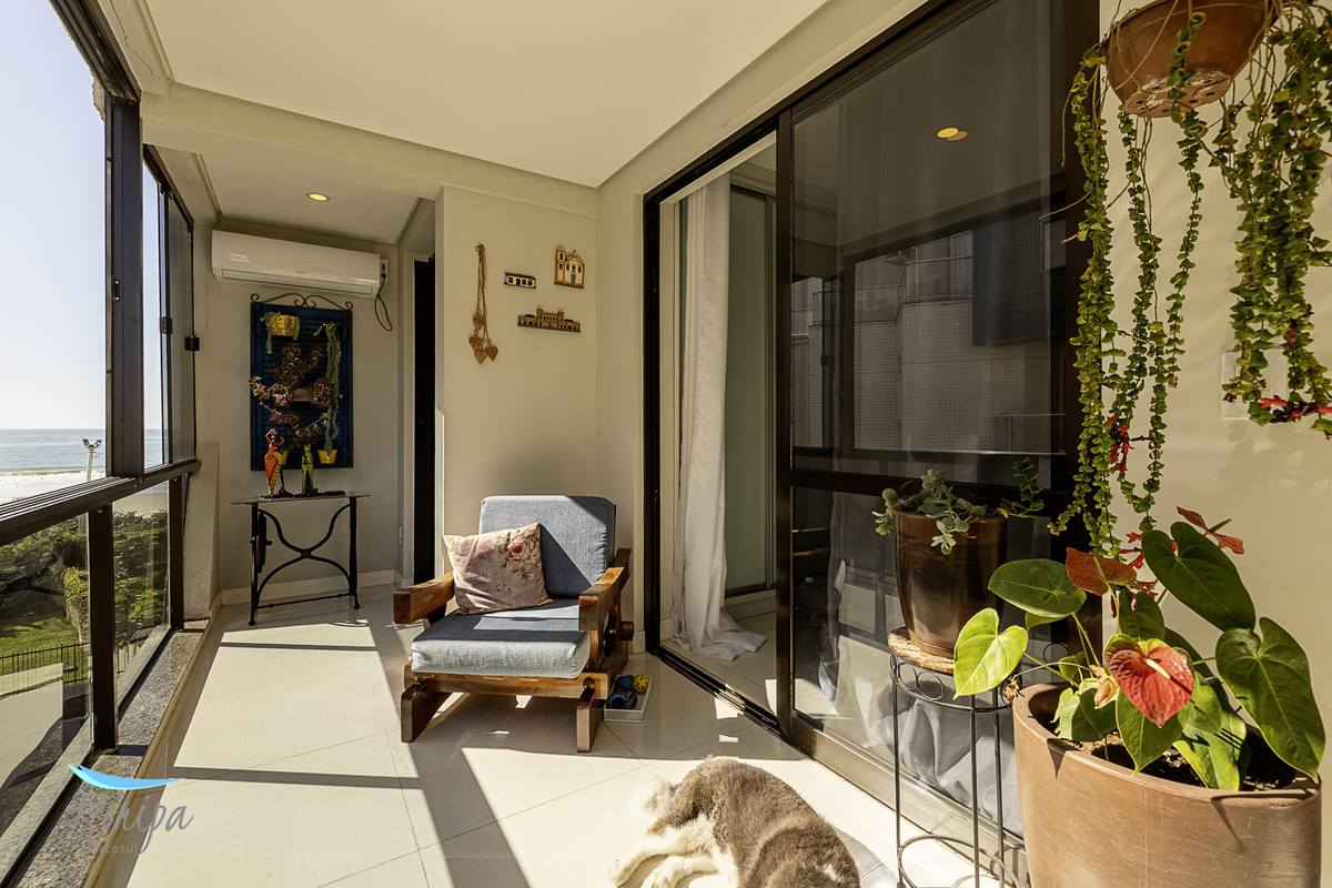 Amplo terraço com churrasqueira, ar condicionado e vista parcial do mar. 129m² de área privativa.